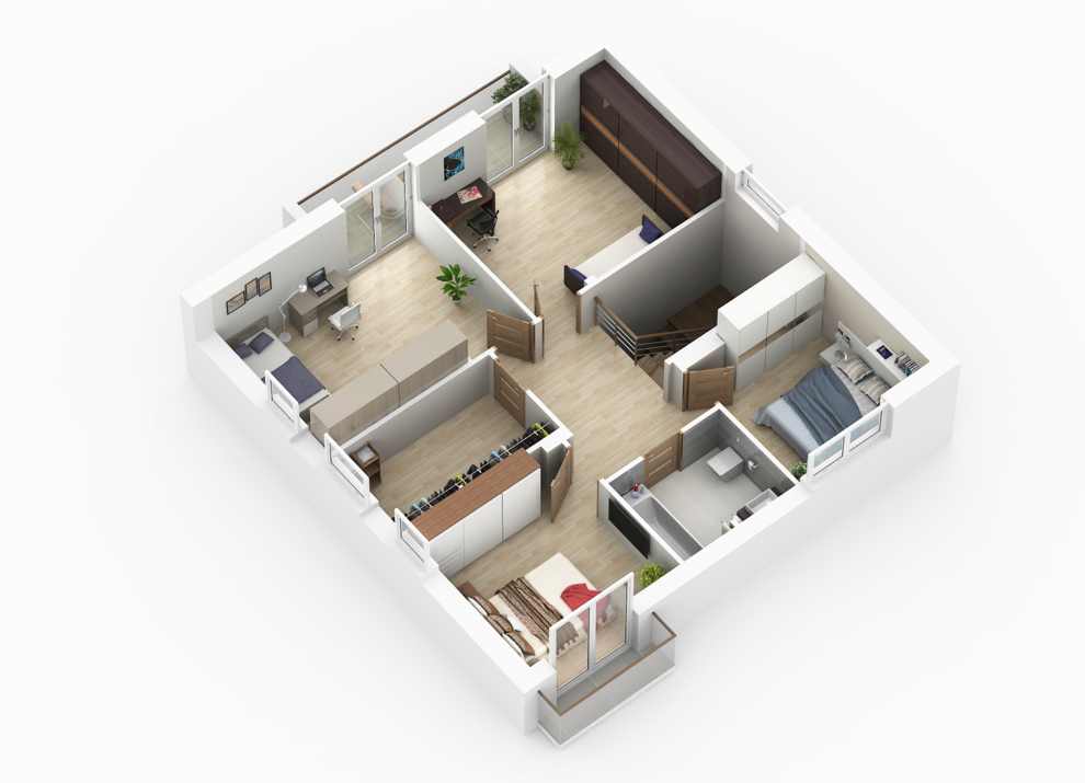 Na piętrze, umieszczono trzy sypialnie z łazienką, oraz dodatkowy pokój mogący służyć jako gabinet, sypialnia gościnna, albo garderoba.
